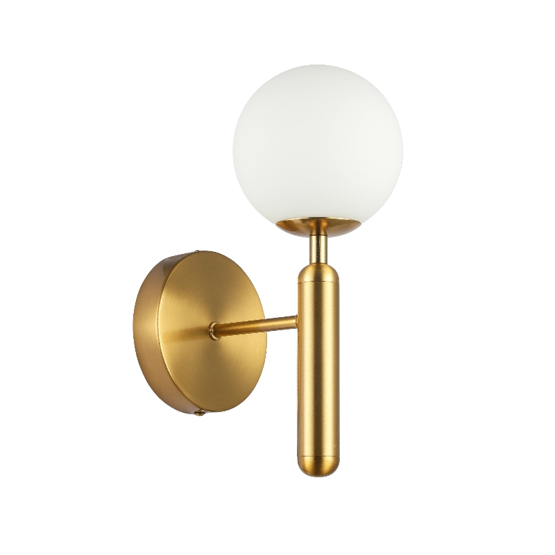 Achieve perfect visual balance with this thoughtfully designed wall sconce. A spherical opal glass shade sits atop a vertical brass bar, which extends from a circular backplate. The interplay of circles and cylinders creates a harmonious modern look, while the warm G9 light adds a cozy layer of brightness to your reading nook or vanity.
