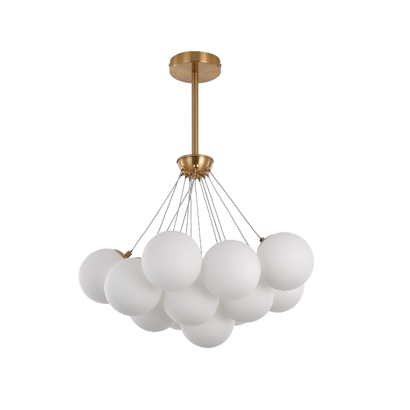 Designed to mimic a floating cluster of luminous orbs. A plating gold ceiling mount and adjustable downrod support a central gold hub, from which thin cables suspend 13 opal glasses in a balanced, airy formation. The soft, warm glow from the opal glass shades creates a gentle, inviting ambiance, perfect for dining areas, master bedrooms, or entryways. With its sleek gold metal accents and organic silhouette, this fixture seamlessly merges modern sophistication with gentle, diffused illumination, ideal for contemporary or minimalist decor.