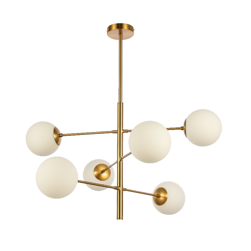 This 6-Light modern molecular chandelier captures the essence of understated luxury and minimalist design. Crafted with a refined plating gold metal frame and white glass/opal glass shades, it features a neat, symmetrical linear structure that exudes calm elegance and artistic balance. The spherical glass shades soften the light into gentle, diffused glow, creating a warm and cozy atmosphere for any interior. Ideal for living rooms, dining areas, bedrooms and modern residential spaces, it integrates sleek contemporary styling with timeless sophistication, serving as both a practical lighting fixture and an elegant decorative.