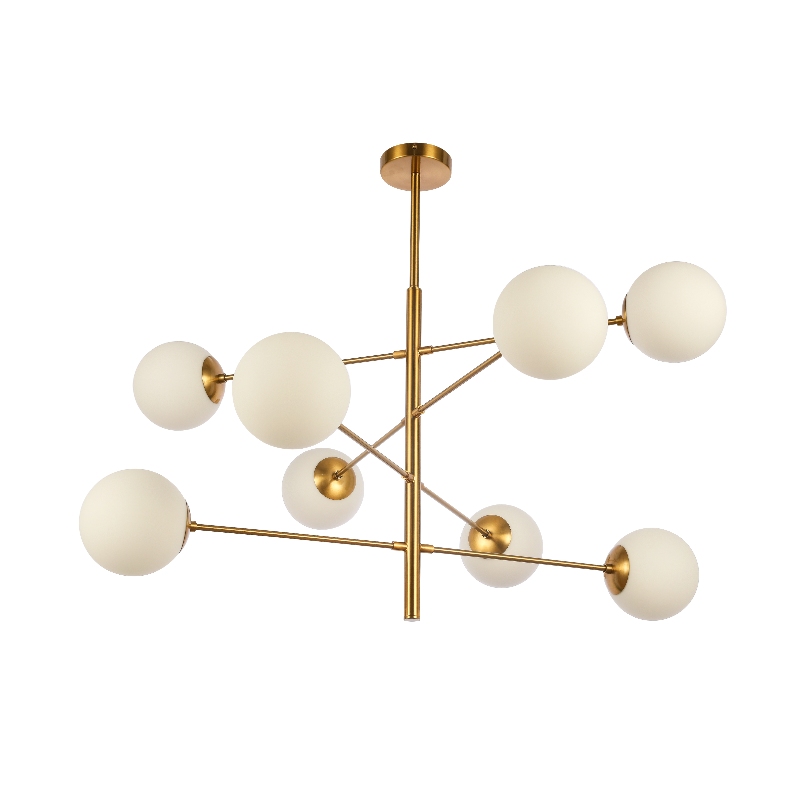 This 8-Light asymmetric chandelier is a striking sculptural statement for contemporary interiors. Built with a premium gold metal structure and white glass/opal glass , it breaks away from traditional symmetry with a dynamic, layered linear arrangement, full of modern artistry and visual rhythm. The irregular yet harmonious composition delivers a unique floating effect, while the opal glass shades produce soft, even illumination that complements any upscale space. Perfect for dining rooms, lounges, lobbies and stylish residential settings, it merges bold design expression with functional lighting, defining modern luxury with personality and grace.