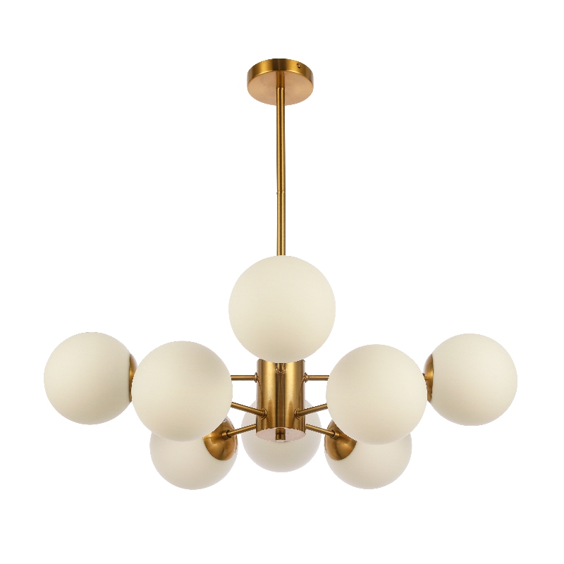A perfect balance of scale and style, this 8-light molecular chandelier showcases a geometric brass frame and luminous opal glass spheres. Its diffused, inviting illumination makes it a stunning centerpiece for open-concept living rooms, dining areas, or boutique hotel lobbies, blending contemporary design with functional warmth.