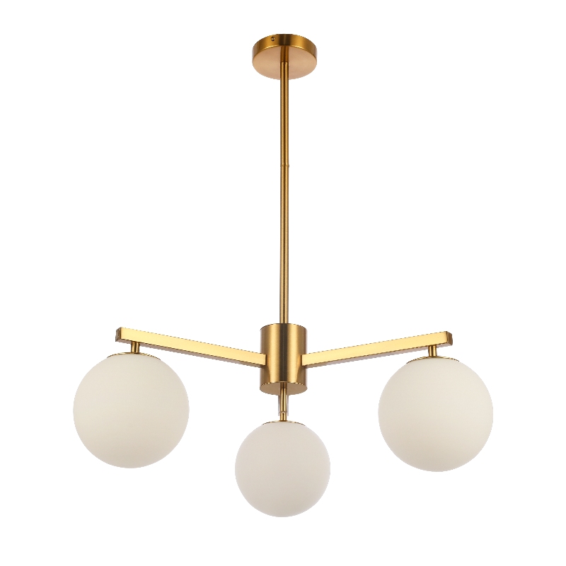 Crafted with a plating gold metal frame, it features a central vertical stem and symmetric horizontal arms, holding three white glass globe shades. The adjustable down rod allows for customizable height installation, while the soft, diffused glow from the globes complements modern, minimalist, or mid-century decor styles. Perfect for kitchens, dining rooms, or entryways, this fixture blends sleek geometric design with warm, inviting illumination.