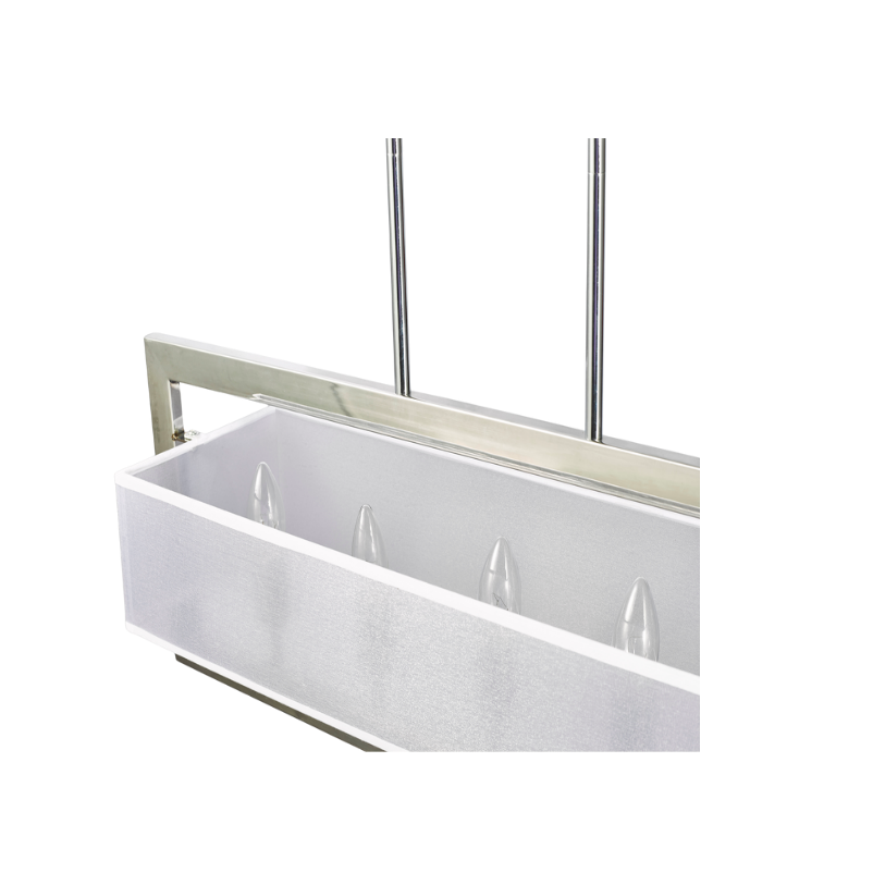 Featuring a sleek linear rectangular silhouette, this statement island chandelier boasts a polished chrome metal frame that exudes modern elegance. Encased within the frame is a delicate sheer organza shade, which diffuses light softly while maintaining a clean, minimalist aesthetic. The contrast between the reflective metal frame and the translucent organza infuses any space with a refined, airy ambiance—making it the perfect centerpiece for long dining tables and kitchen islands.