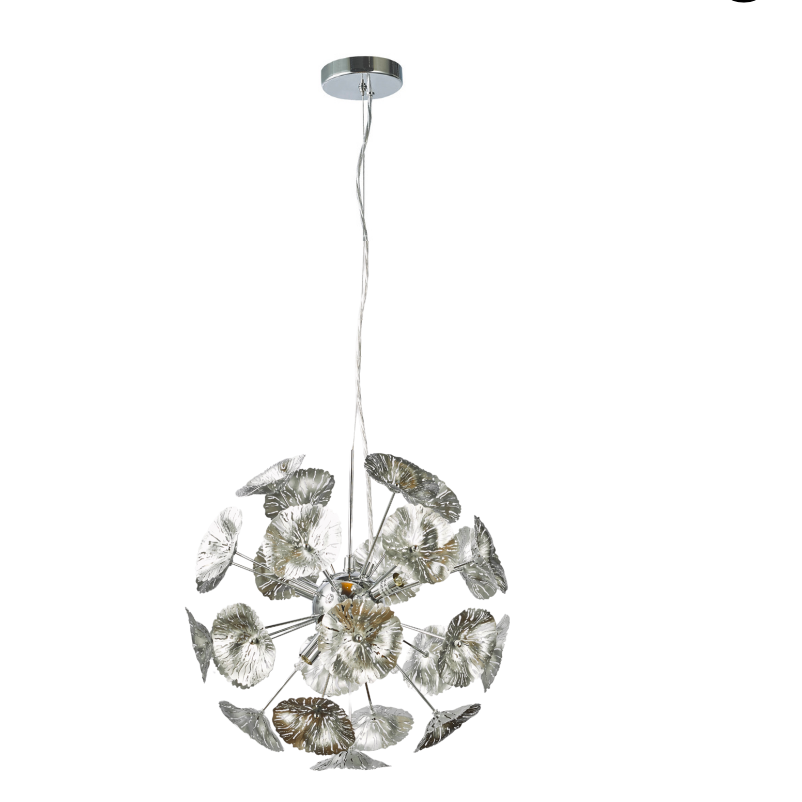 Design: Artistic elegance meets contemporary glamour in this statement chandelier. Adorned with unique lotus leaf-shaped metal discs that radiate outward from a central hub, it creates a stunning, dimensional light effect. The polished chrome finish reflects light beautifully, casting a sparkling and luxurious glow that is perfect for foyers, dining rooms, or grand living areas.