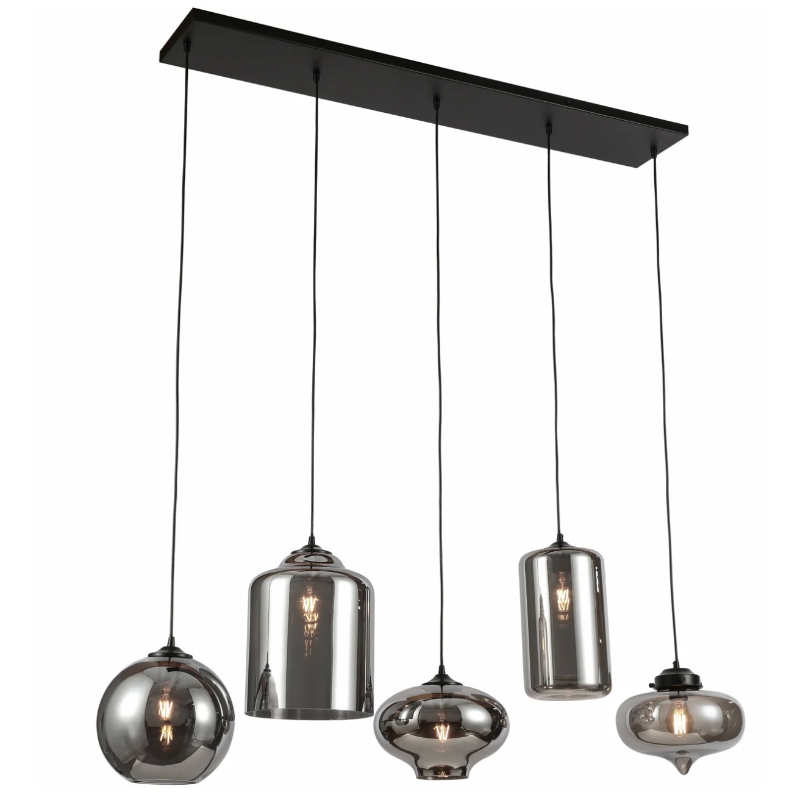 This linear pendant showcases five distinct smoked glass shades—spherical, cylindrical, and gourd-shaped—suspended at staggered heights from a black rectangular ceiling plate. The reflective, tinted glass encapsulates exposed Edison-style bulbs, casting a warm, moody glow that blends industrial edge with eclectic modern style. Ideal for long dining tables, kitchen islands, or contemporary communal spaces, its varied silhouette adds dynamic visual interest.